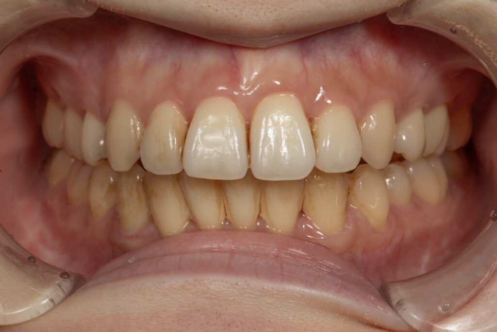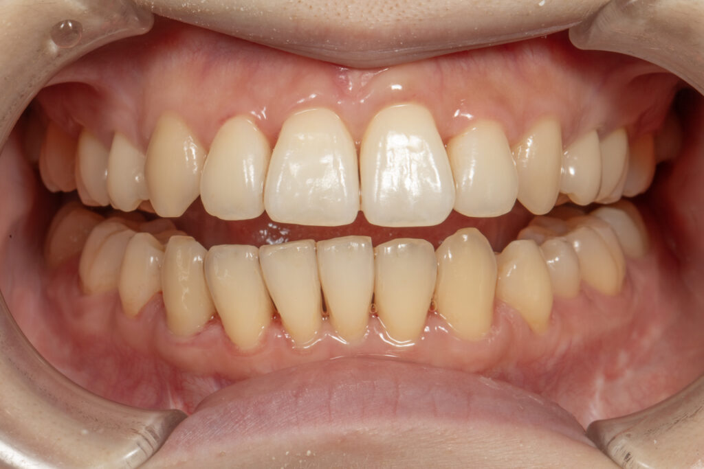 歯肉に大きな炎症はないものの、プラークの停滞と軽度の着色が確認されました。